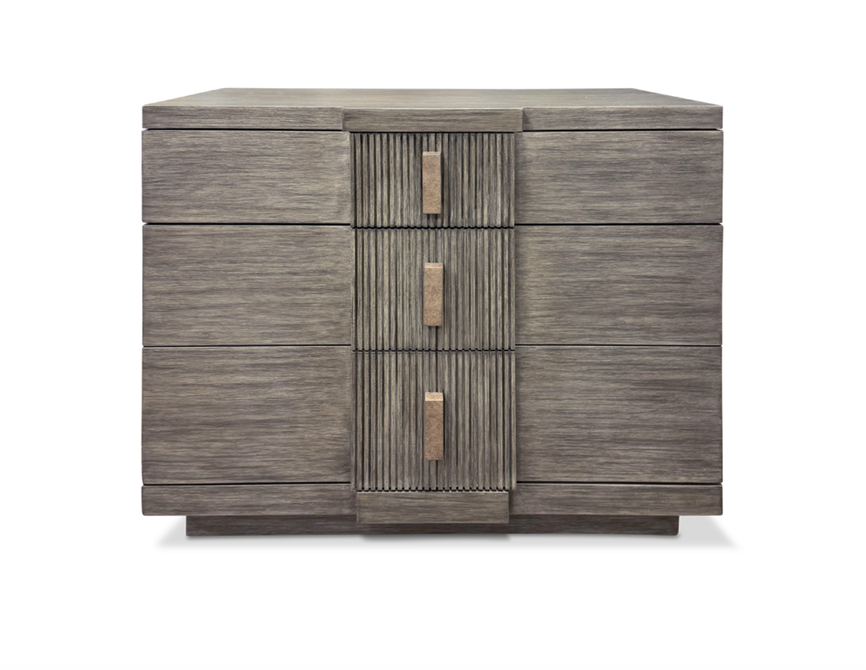 32 x 18.5 x 29h Wood case with 3 drawers and hand-forged iron pulls. Available in White Oak and Walnut. Fully customizable Finishes Shown: Case & Drawers: Clay (wire-brushed) on Walnut Pulls: Aged Bronze