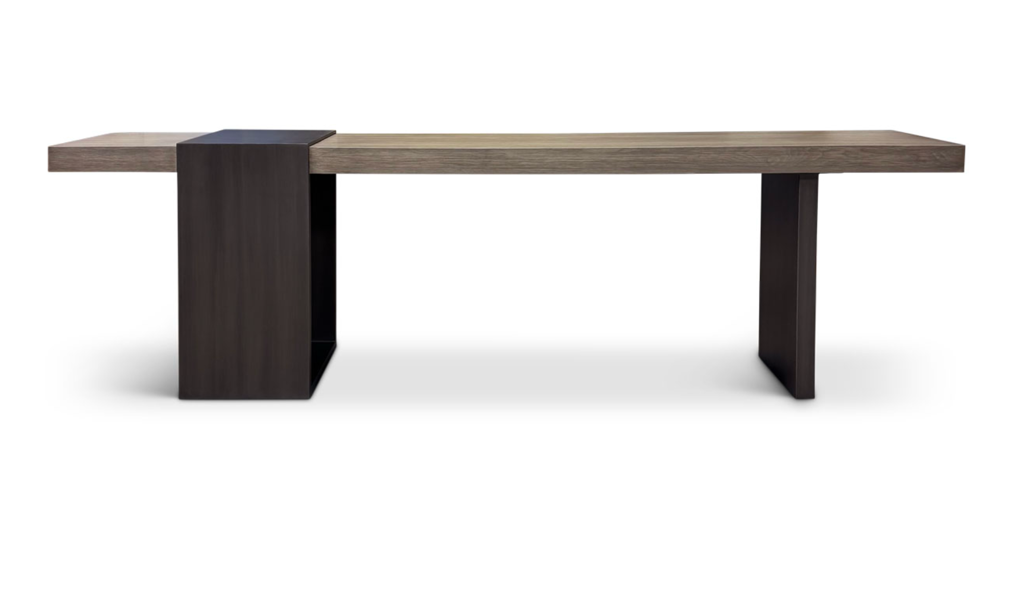 96 x 18 x 29h 2.75" thick top on iron legs. Top available in White Oak and Walnut (shown). Fully customizable. Finishes Shown Top: Custom on Walnut Base: Dark Bronze