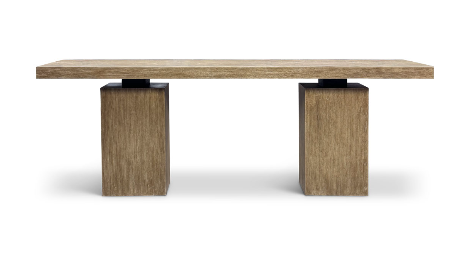 96 x 18 x 34h 2.75" thick top on wood legs. Top available in White Oak, Walnut and lightweight Cast Stone. Base available in White Oak and Walnut. Fully customizable. Finishes Shown Saddle on Walnut