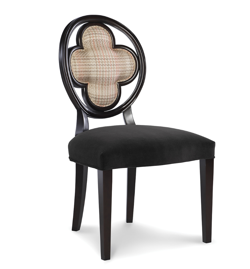 The Caron Side Chair embodies timeless sophistication with a distinctive artistic edge. Its sculpted back features an elegant quatrefoil motif — a graceful nod to classic design. Expertly crafted for both style and comfort, the Caron’s refined silhouette and sturdy tapered legs make it an ideal choice for formal dining or elegant accent seating. Height: 37.75", Width: 22.5", Depth: 23.5" Inside Width: 22.5" Inside Depth: 19" Seat Height: 19.5" COM Requirement : 2.25 yds COL Requirement : 40.5 sq. ft.