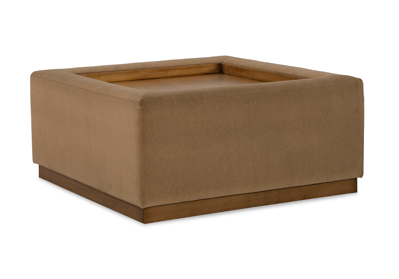 This square ottoman features clean lines and a deep inset wood top framed by plush upholstery. Its structured design and recessed wooden base create a modern, tailored look that blends style with function. Height: 18", Width: 40", Depth: 40" Seat Height: 17" COM Requirement : 3.5 yds COL Requirement : 63 sq. ft.