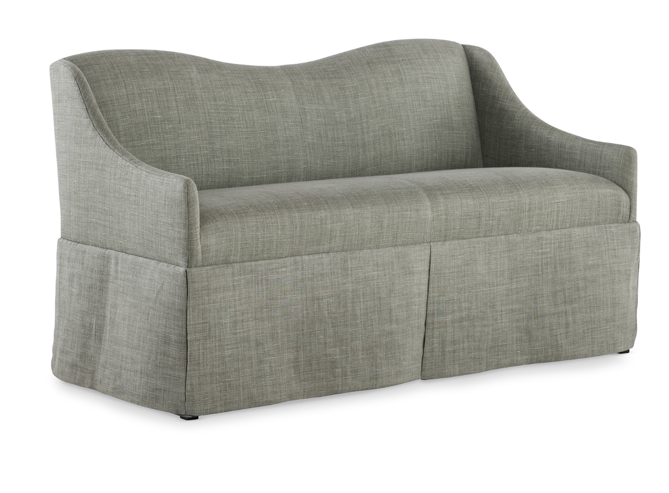 The Eloise Bench captures effortless sophistication through its graceful silhouette and refined simplicity. With its gently scalloped back and softly contoured arms, Eloise offers a fluid, organic shape that feels both sculptural and inviting. Perfect for entryways, dining spaces, or at the foot of a bed, this versatile piece balances form and function with ease. The seamless upholstery and subtle curves highlight expert craftsmanship, making Eloise as beautiful to look at as it is comfortable to sit on. Height: 31.5", Width: 53", Depth: 25.5" Inside Width: 51.5" Inside Depth: 19.5" Seat Height: 19" Arm Height: 21.5" COM Requirement : 7.5 yds COL Requirement : 135 sq. ft.